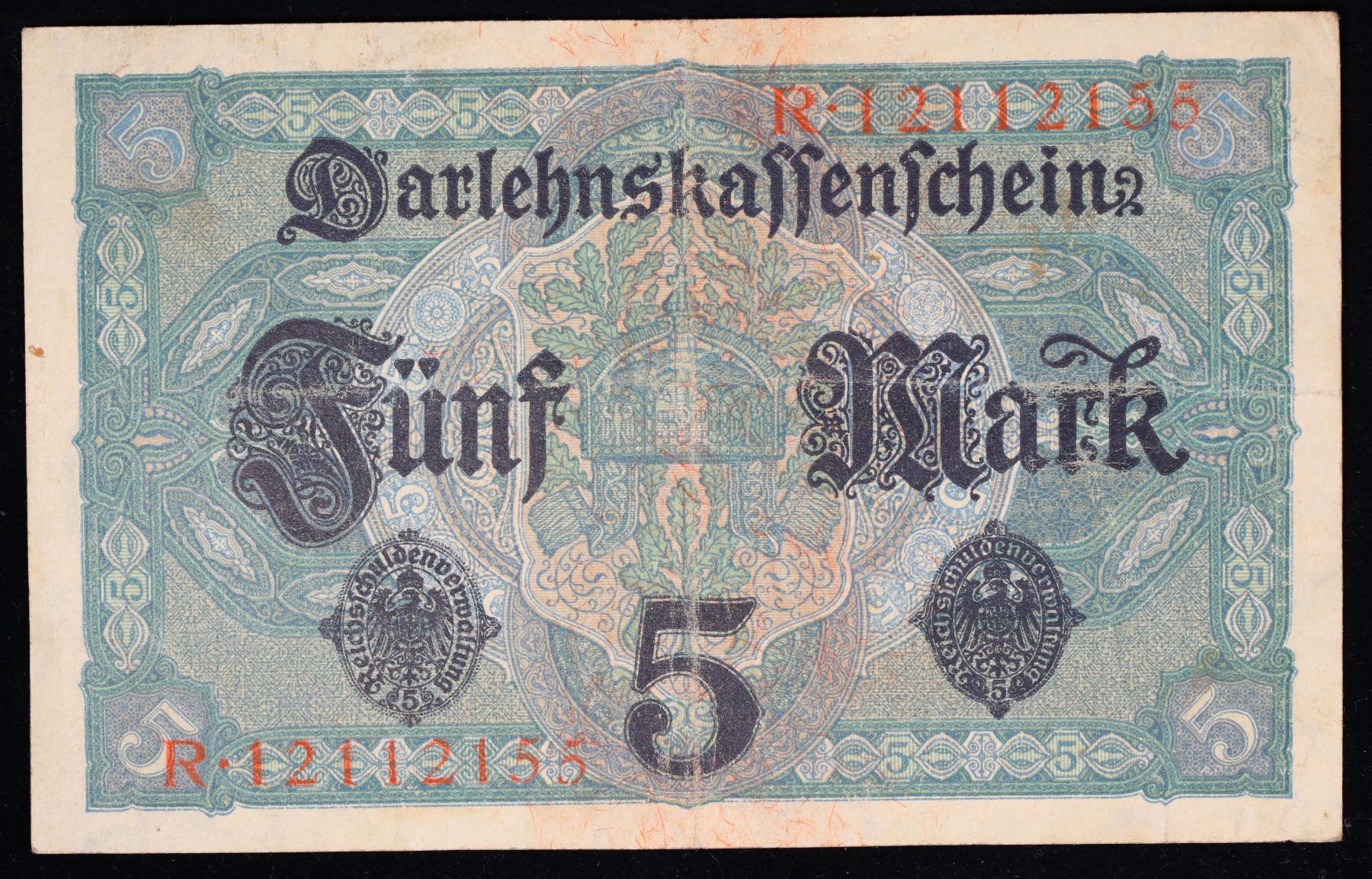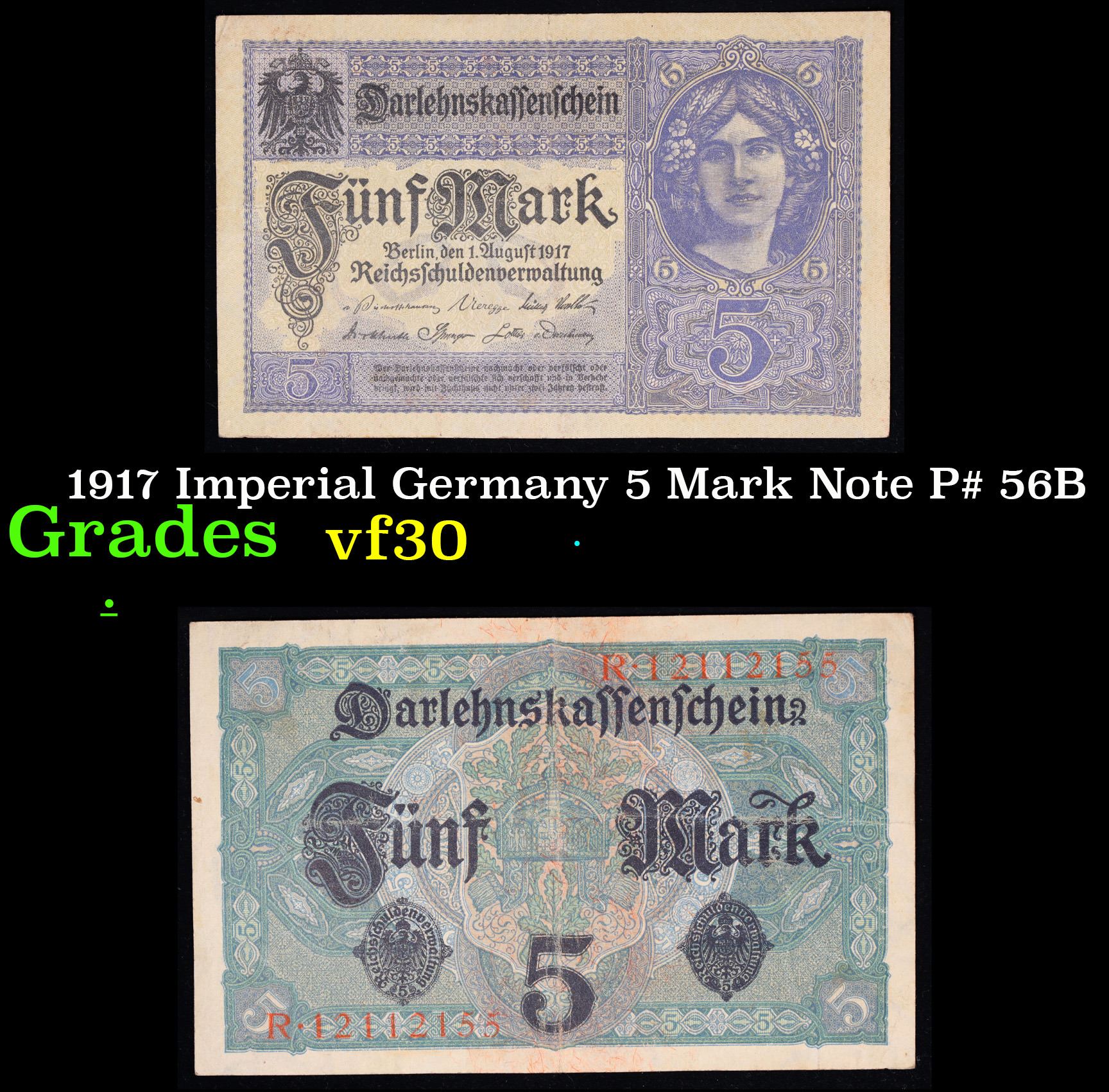 1917 Imperial Germany 5 Mark Note P# 56B Grades vf++. In August 1914, Directly after the onset of WW1, the German Empire removed the gold backing of the mark and issued new currency. After the fall of the German Empire in 1918, the newly formed German Weimar Republic issued another new currency, known derisively as the "Paper Mark", which faced massive hyperinflation.