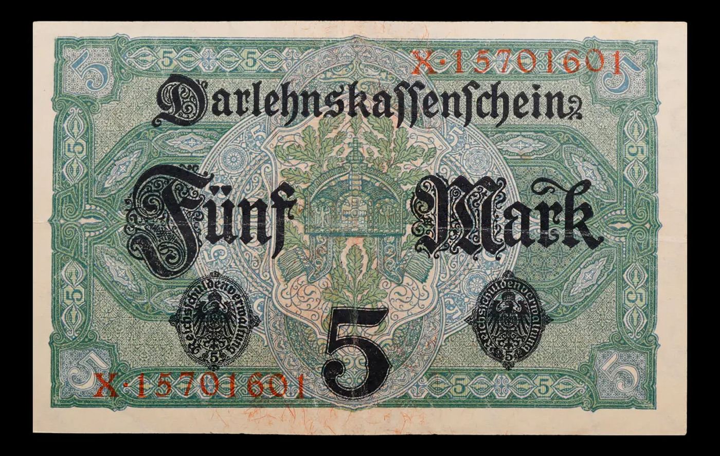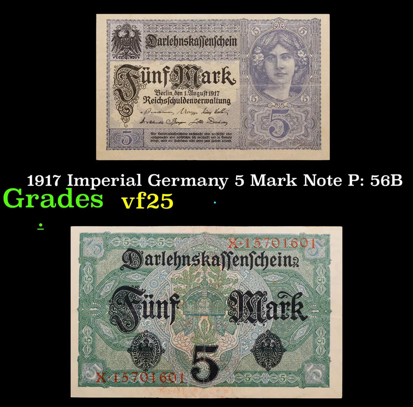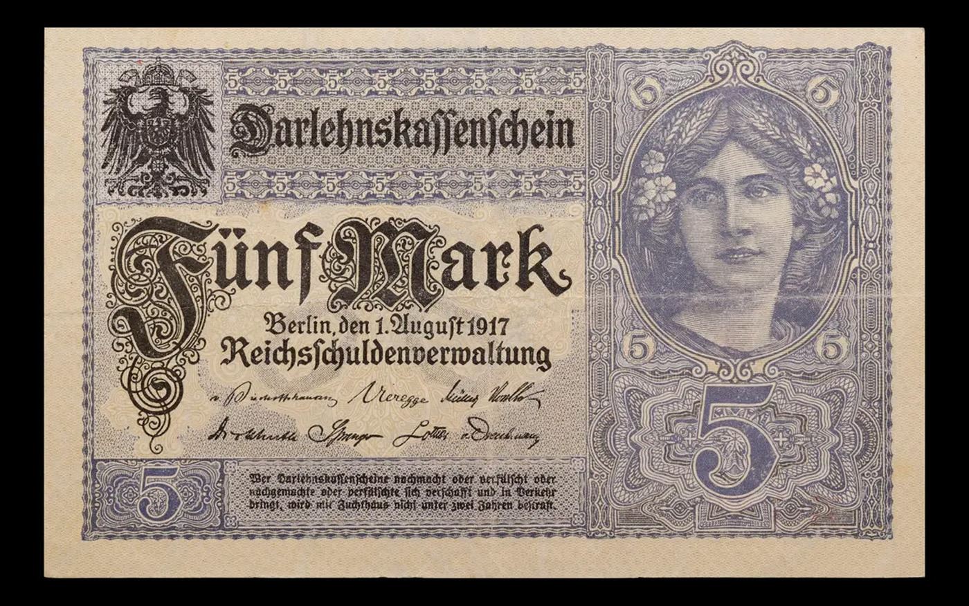 1917 Imperial Germany 5 Mark Note P: 56B Grades vf+. In August 1914, Directly after the onset of WW1, the German Empire removed the gold backing of the mark and issued new currency. After the fall of the German Empire in 1918, the newly formed German Weimar Republic issued another new currency, known derisively as the "Paper Mark", which faced massive hyperinflation.