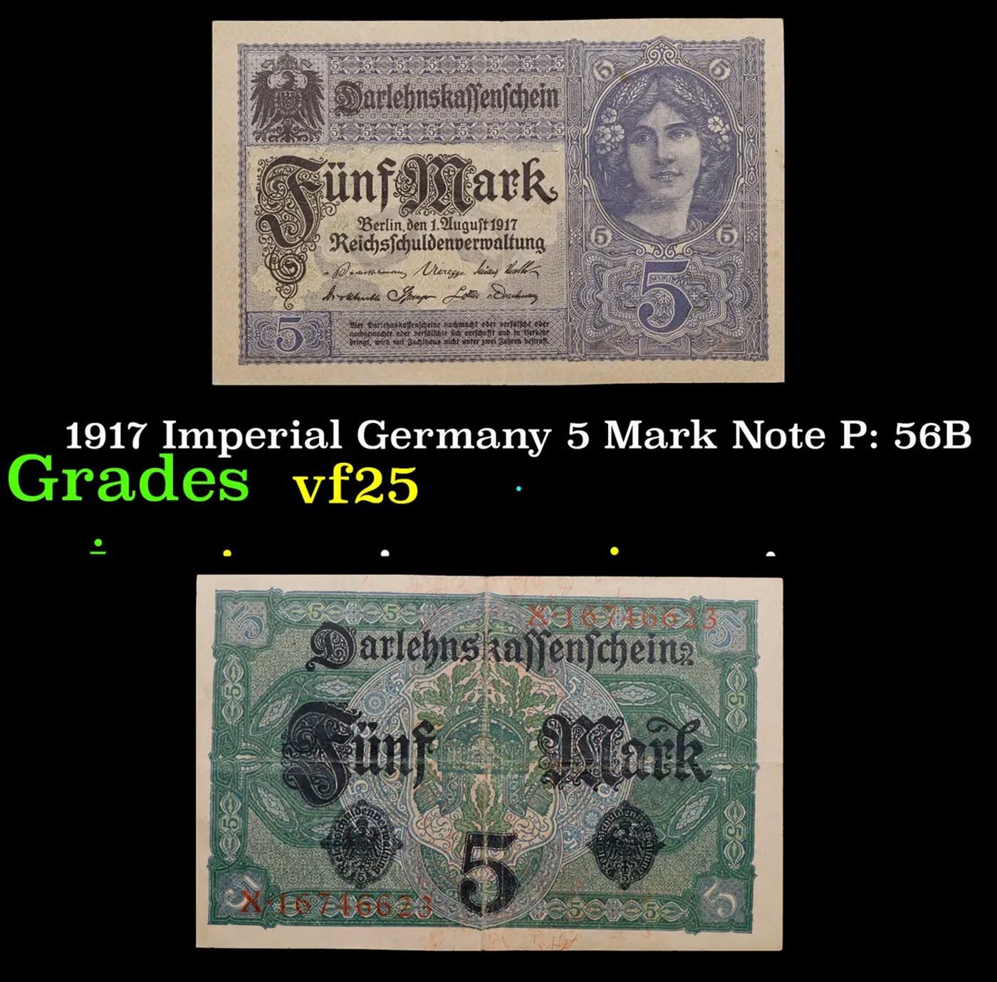 1917 Imperial Germany 5 Mark Note P: 56B Grades vf+. In August 1914, Directly after the onset of WW1, the German Empire removed the gold backing of the mark and issued new currency. After the fall of the German Empire in 1918, the newly formed German Weimar Republic issued another new currency, known derisively as the "Paper Mark", which faced massive hyperinflation.
