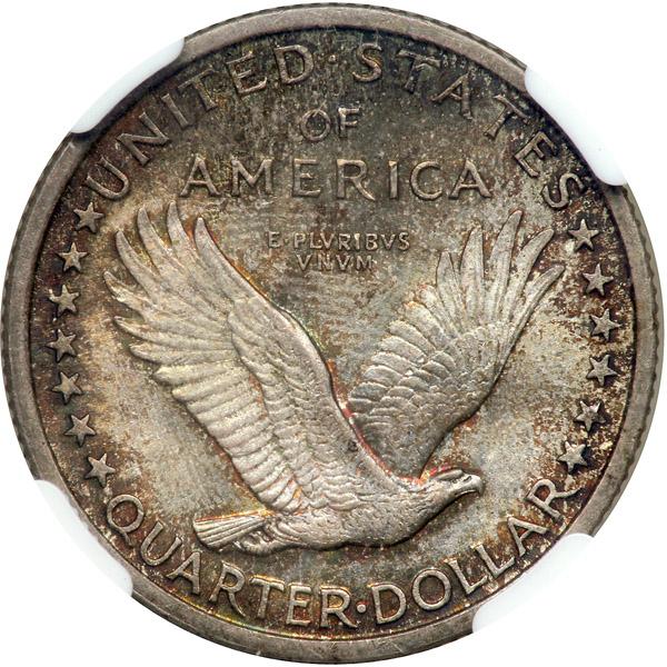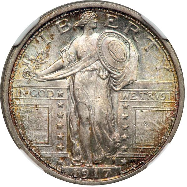 1917 Liberty Standing Quarter Dollar. Type 1. NGC graded MS-65+ Full Head. Gorgeous natural multi-color toning on both sides. Bold careening luster spins broadly beneath the heavenly highlights. The obverse and reverse strike shows complete detail, a trait of nearly all P-mint 1917 Type One quarters, making the present specimen well suited where design definition is concerned in a U.S. 20th century Type Set. Pop 2 in the 65+ grade.