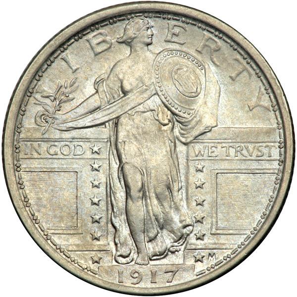 1917 Liberty Standing Quarter Dollar. Type 1. PCGS graded AU-58. Creamy-white in color (PCGS # 5706) .