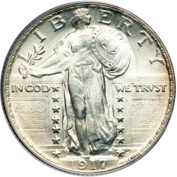 1917 Liberty Standing Quarter Dollar. Type 2. PCGS graded MS-65 Full Head. A creamy-white gem specimen, well struck and demanding your attention. Traces to an early "name" sale of the 20th century (PCGS # 5715) .