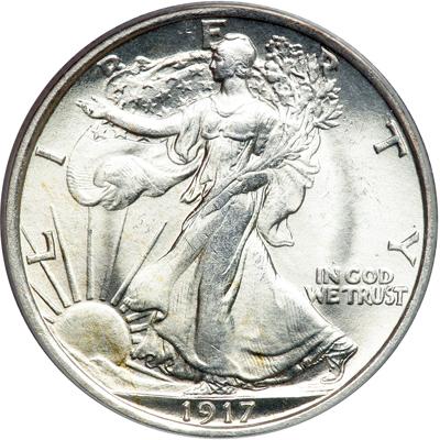 1917 Liberty Walking Half Dollar. PCGS graded MS-65. A nice white coin that is a shade softely struck in the centers, but more than made up for by the radiant jewel-whitness of the luster. Picture-perfect. A coin for the connoisseur's enjoyment (PCGS # 6569).