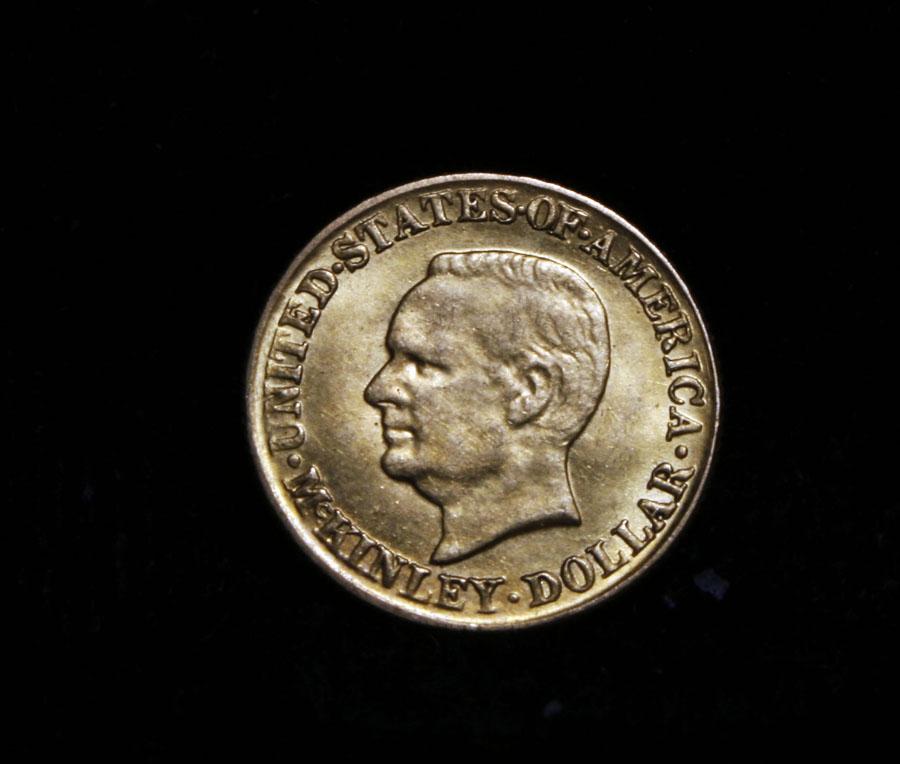 Terrific example of this scarce Gold commemorative. Issued in 1917 on the 75th Anniversary of McKinley's birth, but due to his untimely demise by an assassin, this commemorative was issued to help create a memorial in his hometown. When examining a McKinley Commem Points to examine for the first signs of wear include McKinley’s temple and the hair above his ear; on the reverse, check the pillar above the second numeral 1 and the base of the flagpole. The 1917 is much scarcer with Q. David Bowers estimating only 5,000 pieces were ever distributed. Coin World's Coin Values lists ms63 at $1100 and The Wholesale Greysheet lists ms63 at $770 (note in xf the coin wholesales for $500, scarce in any grade). Estimated Value $850