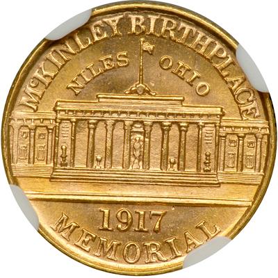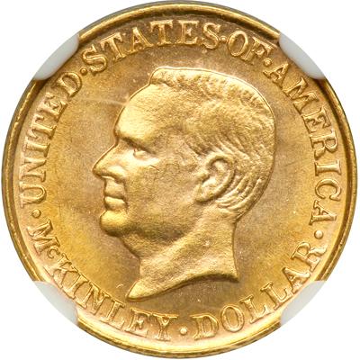 1917 McKinley Gold Dollar. NGC graded MS-65. A bright sparkling gem example with one tiny mark on the cheek below the eye keeping it a point or two lower than it might have been. Desirable with this meticulous strike, the MeKinley Memorial issues of 1916 and 1917 are as a rule sharply struck (although there never was much design detail in the fallen President's hair in the first place. A simple yet suitable design paying tribute to the 25th President of the United States. In a new 4 pronged NGC holder (PCGS # 7455).
