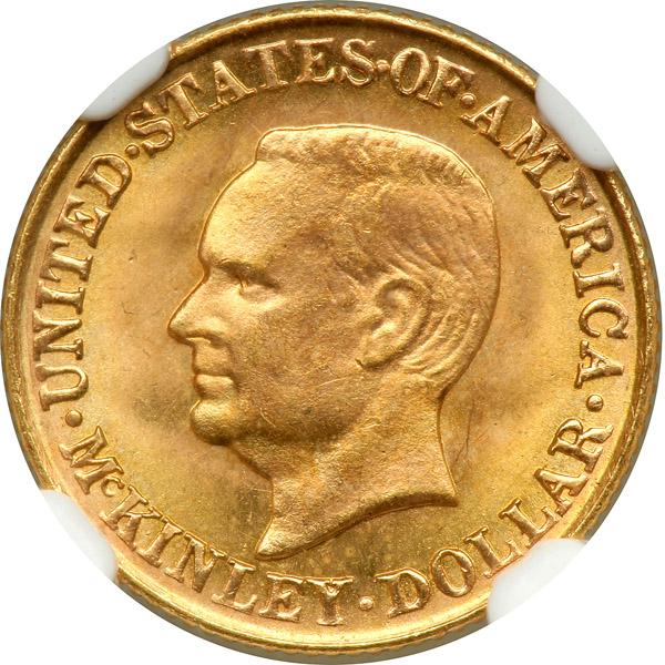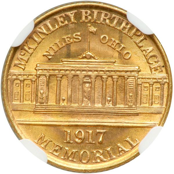 1917 McKinley Gold Dollar. NGC graded MS-66. Lovely reddish-golden surfaces. Booming luster and satiny-fresh appearance. William McKinley was the third American president to be assassinated (Lincoln & Garfield preceded in 1861 and 1881), although an earlier attempt was made to shoot President Andrew Jackson as well. (On that occasion in 1835, when the perpetrator made his move using a pair of flintlock pistols which failed to fire properly, Jackson hit him over the head repeatedly with his walking stick until the miscreant was subdued by others in the entourage. It was dangerous thing to enrage Andrew Jackson!) (PCGS # 7455) .