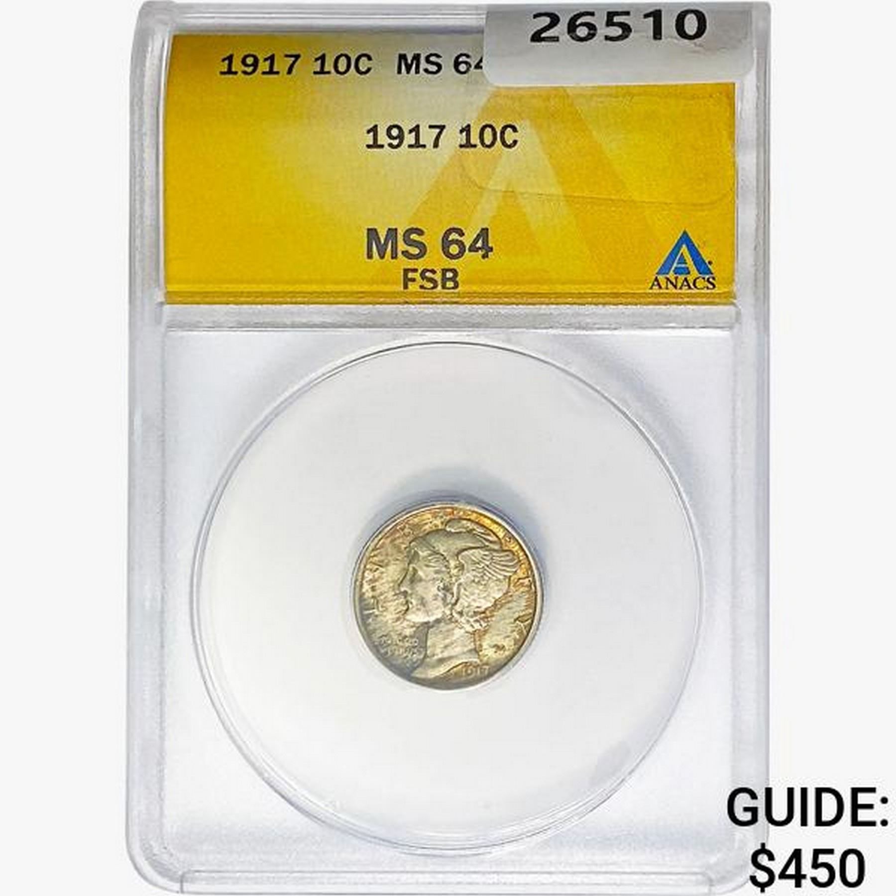 1917 Mercury Silver Dime ANACS MS64 FSB