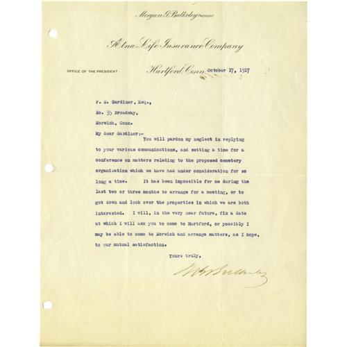 <B>1917 Morgan Bulkeley Signed Letter.</B></I> This Civil War veteran was instrumental in the formation of the National League in 1876 and served as its first president, using his powers to target drinking, fan rowdiness and illegal gambling. Many a quality Hall of Fame collection is lacking a genuine Bulkeley autograph, but one will fill that gap with this offering. Typed letter on "Aetna Life Insurance Company" (founded by his father) letterhead regards business matters relating to a "cemetery organization," and is signed at the close in 9/10 black fountain pen ink. A single pinpoint of moisture has touched one letter of the autograph, but to very little effect. Page exhibits original mailing folds and three-ring binder holes at left edge, otherwise NRMT. <I>LOA from PSA/DNA.</B></I>