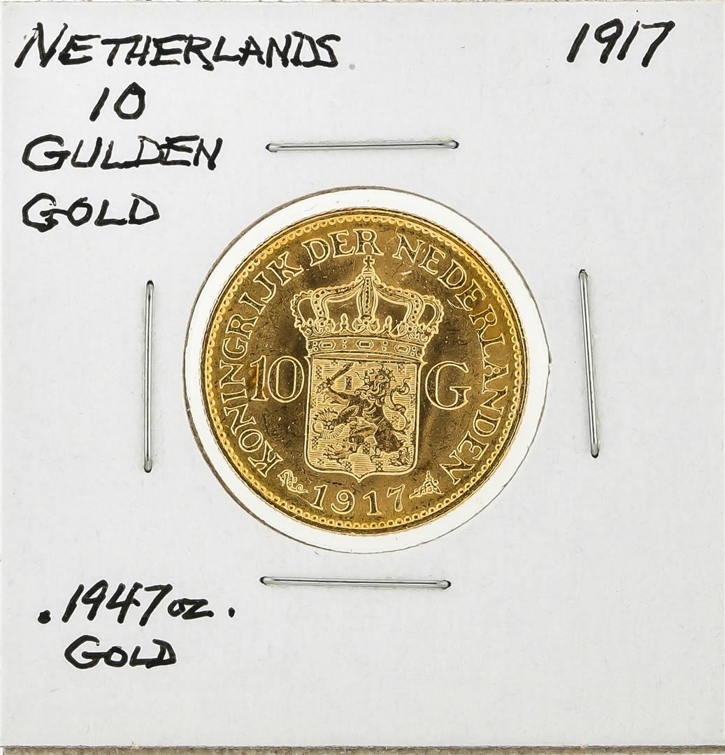 One 1917 Netherlands 10 Goulden Gold Coin.