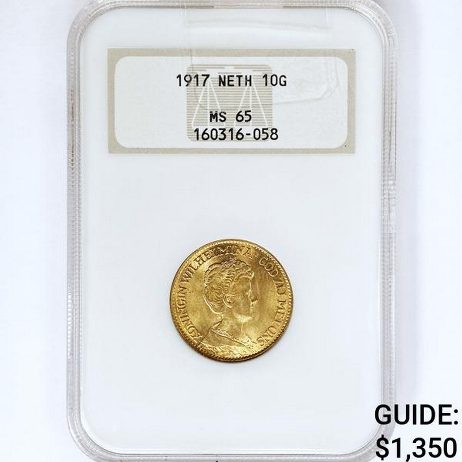 1917 Netherlands .1947oz Gold 10 Gulden NGC MS65