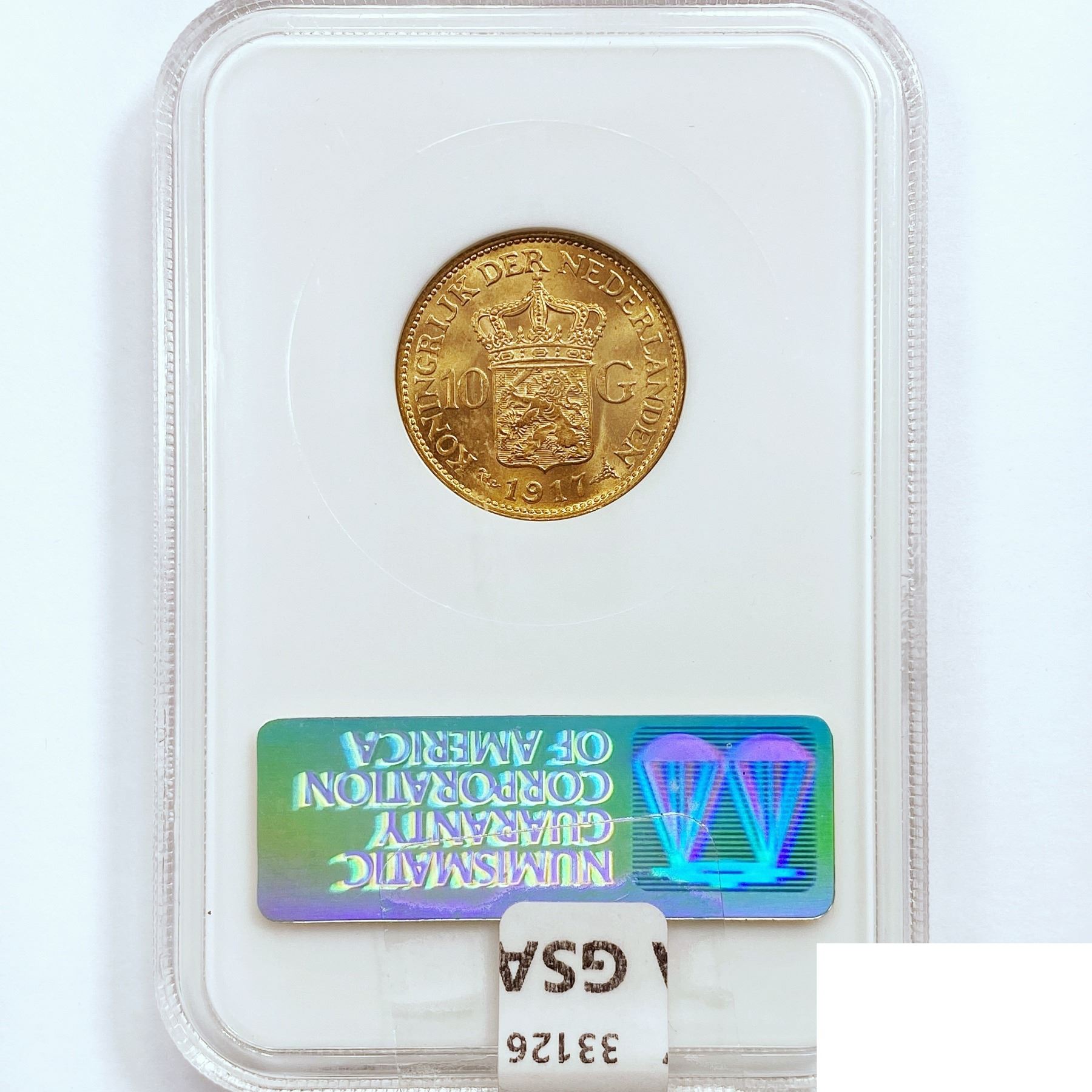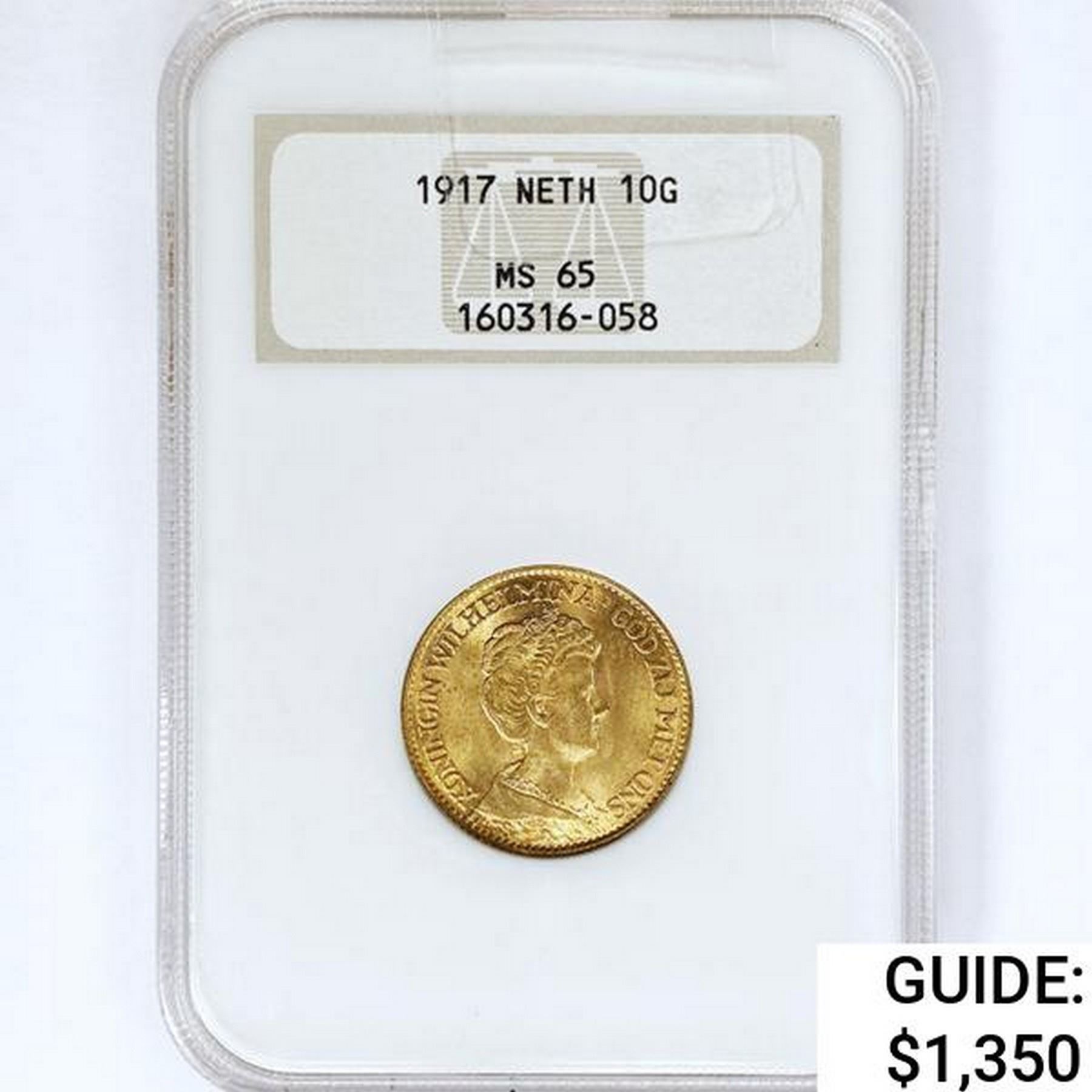 1917 Netherlands .1947oz Gold 10 Gulden NGC MS65