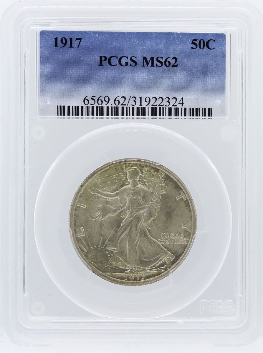 One 1917 PCGS MS62 Liberty Walking Half Dollar. PCGS Certified.