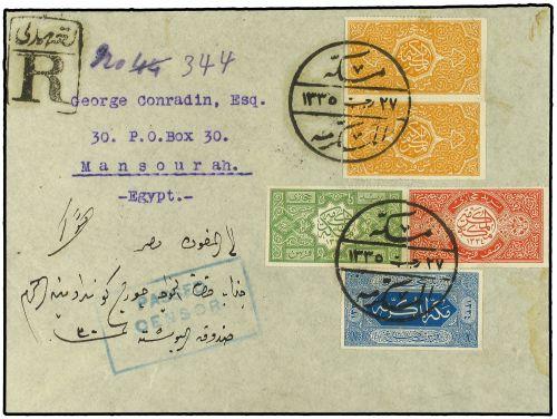 1917 Registered envelope to EGYPT bearing 1/8 pi yellow (pair) 1/4 pi green, 1/2 pi red and 1 pi blue (SG 7,8,9,10) tied by ARABIC DJEDDA datestamp with boxed hand-struck registered and EGYPTIAN PASSED BY CENSOR cachet in blue, routed via Port Taufiq and Cairo with MANSURA arrival. Superb quality cover.