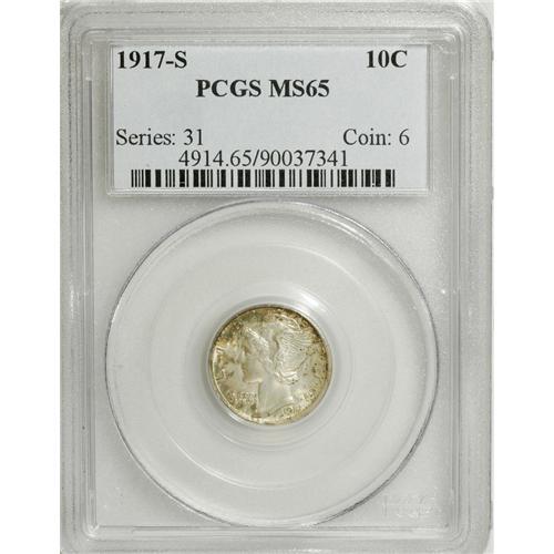 <B>1917-S 10C MS65 PCGS.</B></I> PCGS Population (37/11). NGC Census: (51/16). Mintage: 27,330,000. Numismedia Wsl. Price: $290. (#4914)<BR><BR><b>Shipping:</b> Coins & Currency (<a target="_blank" href="http://www.heritageauctions.com/common/shipping.php">view shipping information</a>)