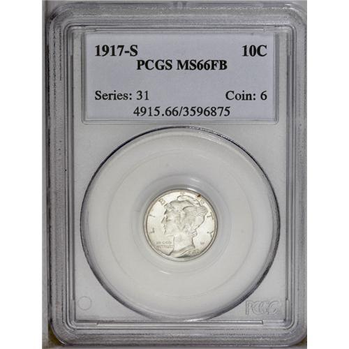 <B>1917-S<10C> MS66 Full Bands PCGS.</B></I> Delicate chestnut and powder-blue toning endows this lustrous and well preserved Premium Gem. The central bands have reasonable definition. A small obverse spot at 1 o'clock barely requires mention. Population: 51 in 66 Full Bands, 10 finer (2/06).