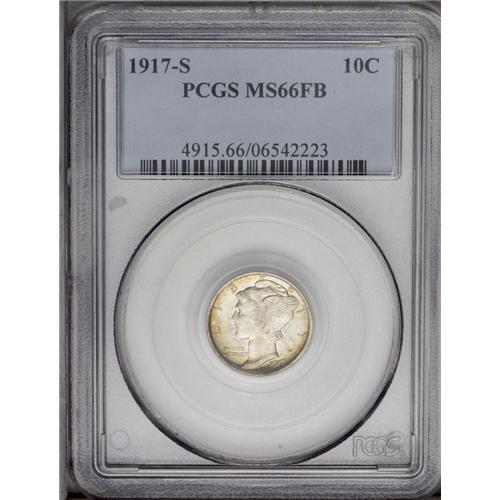 <B>1917-S<10C> MS66 Full Bands PCGS.</B></I> Delicate gold peripheral toning frames essentially brilliant centers. The design features are sharply impressed, culminating in Full Bands. The only mark observed under close scrutiny is a small one located on the lower part of the fasces. Population: 51 in 66, 10 finer (4/06).