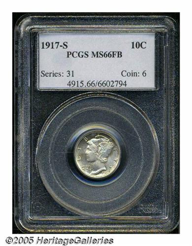 <B>1917-S<10C> MS66 Full Bands PCGS.</B></I> Typically bold with vibrant matte-like surfaces and hints of speckled toning in the recesses of the obverse. A solid Premium Gem example of this early S-mint, only infrequently found finer. Population: 50 in 66, 10 finer (6/05).