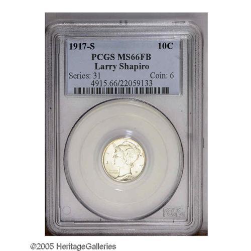 <B>1917-S<10C> MS66 Full Bands PCGS.</B></I> White and lustrous, with a splash of dark gold toning on the reverse tucked in along the right side of the fasces and branch, with traces on Liberty's cap as well. Clean surfaces throughout, and attractive. Population: 51 in 66, 10 finer (12/05).<BR><I>From The Larry Shapiro Collection of Mercury Dimes.</B></I>