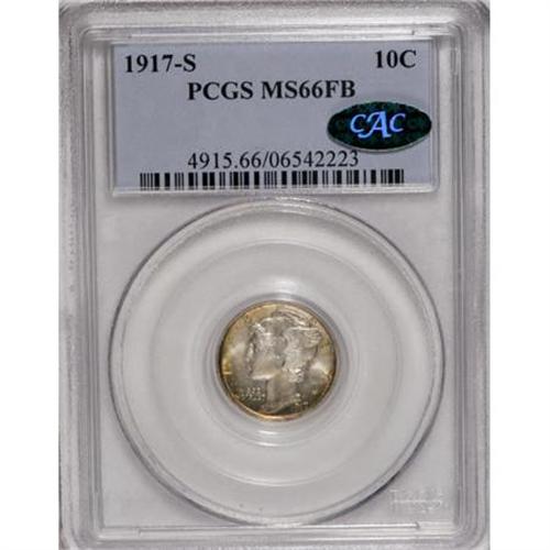 <B>1917-S 10C MS66 Full Bands PCGS.</B></I> Delicate gold peripheral toning frames essentially brilliant centers. The design features are sharply impressed, culminating in full bands and distinct peripheral legends. Population: 59 in 66, 10 finer (3/08).<BR><I>From The Good Humor Collection.</B></I><BR><BR><B>Coin Engraver:</B> Adolph A. Weinman<BR><BR><b>Shipping:</b> Coins & Currency (<a target="_blank" href="http://www.heritageauctions.com/common/shipping.php">view shipping information</a>)