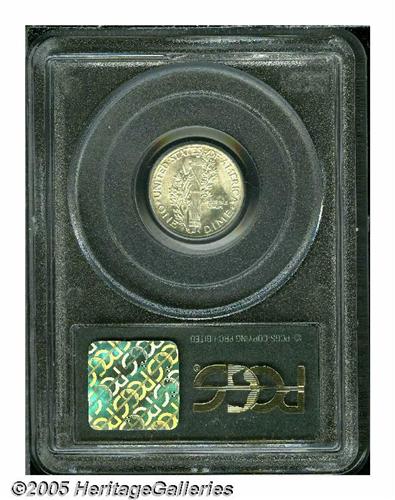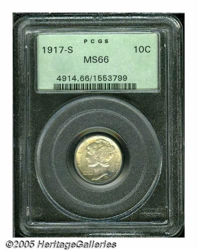 <B>1917-S<10C> MS66 PCGS.</B></I> This older holder premium Gem is light gold in color aside from a whisper of sky-blue patina on the lower obverse. The borders are intricately struck, while the centers are not quite completely brought up by the dies. A lustrous and beautifully preserved early S-mint Mercury Dime. Population: 9 in 66, 1 finer (5/05).