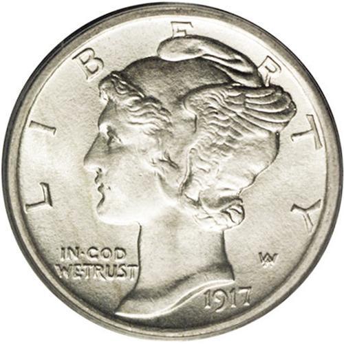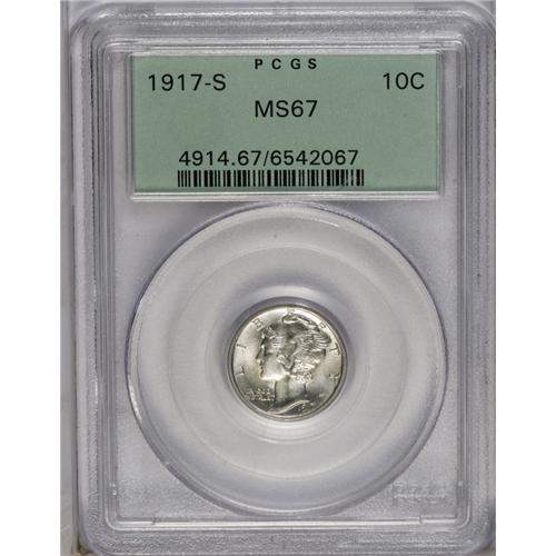 <B>1917-S<10C> MS67 PCGS.</B></I> This is a Superb Mint State example in a green-label PCGS holder. Both sides are brilliant with silvery-white surfaces and no indication of toning. It is sharply struck with virtually full central bands exhibiting only the slightest merging at the center. To date, this is still the highest grade of this date certified by PCGS, although a small number of Full Bands examples have also received the MS67 grade.