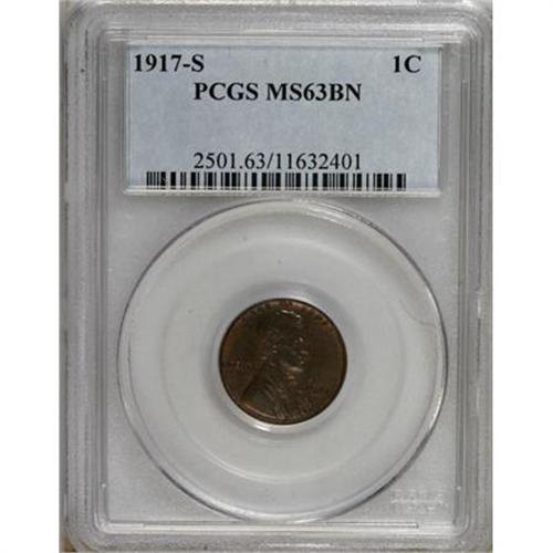 <B>1917-S 1C MS63 Brown PCGS.</B></I> PCGS Population (51/30). NGC Census: (34/56). Mintage: 32,620,000. Numismedia Wsl. Price for NGC/PCGS coin in MS63: $117. (#2501)<BR><BR><B>Coin Engraver:</B> Victor D. Brenner<BR><BR><b>Shipping:</b> Coins & Currency (<a target="_blank" href="http://www.heritageauctions.com/common/shipping.php">view shipping information</a>)