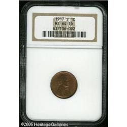 <B>1917-S 1C MS64 Red NGC.</B></I> The lustrous surfaces show warm red and tan coloration and just a few carbon flecks. This is a difficult issue to find with original mint luster.<BR><I>From The Kim Mitchell Collection, Part Two.</B></I> Lot:5445