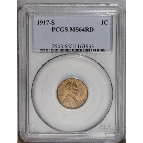 <B>1917-S<1C> MS64 Red PCGS.</B></I> Coppery-gold luster endows each side of this nicely struck near-Gem. A few minor ticks scattered about do not distract. Population: 57 in 64, 16 finer (3/06).<BR><I>From The Kendall Marie #4 All-Time Finest PCGS Registry of Lincoln Cents with Varieties, Circulation Strikes, 1909-1958.</B></I> <BR><BR><B>Important notice:</B> Heritage usually auctions material at the rate of 200-250 lots per hour. On some occasions eBay Live bid software or the Internet may not be able to keep up with the pace of the auction. We recommend placing a realistic absentee bid now as insurance to avoid disappointment. Occasionally the auctioneer may eliminate or reject an eBay Live bid, and the auctioneer may also reopen a lot after the close of the eBay live bidding (usually because we missed an audience bid), and may reject your bid even if it shows you as the winning bidder. By bidding via eBay Live, you agree that Heritage may award the lot to another bidder at its sole discretion under the circumstances described above or any other reasonable circumstances. Since eBay bids are not shown to us until we open the lot on the floor, we treat those bids just like floor bids. In most cases the floor responds before the eBay bid is presented to us, due to Internet lag time, so for consistency we have made it a policy that floor bids are always considered first over tie eBay live bids. Also please note that all Heritage lots purchased through eBay Live carry a 20% Buyer's Premium. Please make sure you read the Terms and Conditions before you bid. This lot is being auctioned in conjunction with a live floor auction by Heritage Galleries & Auctioneers. All final auction and invoice information will be supplied by Heritage Galleries & Auctioneers, and all other information should be considered preliminary. Lot:493 <BR><BR><B>Winning Notification and Billing:</B> After the FINAL session in this auction is complete, Heritage will send e-mail and snail mail invoices. This process normally takes several days. All final auction and invoice information will be supplied by Heritage Galleries & Auctioneers, and all other information should be considered preliminary. <BR><BR>This auction will be conducted on a live auction floor and over the Internet through eBay Live. If you choose to place an absentee bid, please take a moment to <font color='#0000ff'><u><a href='http://pages.ebay.com/liveauctions/help/before/laabsentee.html'>learn how eBay Live absentee bidding works</a></u></font><font color='#000000'>
