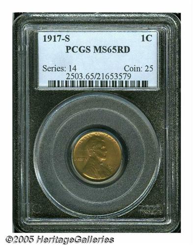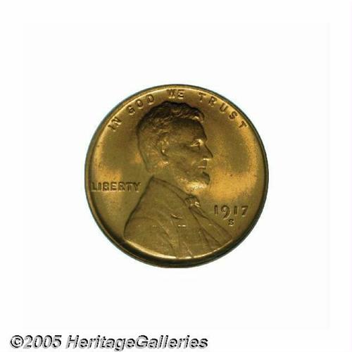 <B>1917-S<1C> MS65 Red PCGS.</B></I> This elusive S-mint Lincoln shows copper-orange toning overlying lustrous surfaces that are essentially unabraded. A few small flecks are scattered about the obverse, but none are bothersome. The design elements on this coin are surprisingly well struck, with good detail showing on Lincoln's beard and in the hair. As sharp as the present coin is, it does display some of the effects of protracted die use, in that the reverse surfaces are subtly warped. Coins of the 1917-18 era, especially those from the branch mints, are typically poorly struck. This can be attributed to overextended die usage during this critical wartime period. The onset of America's involvement in World War I led to a shortage of Cents. The mints were working three shifts around the clock to alleviate this shortage, and it showed in the quality of their product. Denver and San Francisco issues were especially poor. Population: 15 in 65, 1 finer (6/05).<BR><I>From The William Bickel Collection, Part One.</B></I>