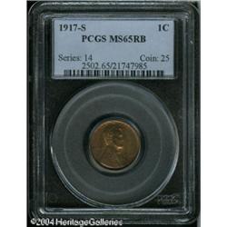 1917-S 1C MS65 Red and Brown PCGS. A sharply struc <B>1917-S 1C MS65 Red and Brown PCGS.</B></I> A sharply struck and shimmering Gem, there are no remotely relevant marks and the dusky tan-rose color is clearly original. <BR><BR><B>Important notice:</B> Heritage usually auctions material at the rate of 200-250 lots per hour. On some occasions eBay Live bid software or the Internet may not be able to keep up with the pace of the auction. We recommend placing a realistic absentee bid now as insurance to avoid disappointment. Occasionally the auctioneer may eliminate or reject an eBay Live bid, and the auctioneer may also reopen a lot after the close of the eBay live bidding (usually because we missed an audience bid), and may reject your bid even if it shows you as the winning bidder. By bidding via eBay Live, you agree that Heritage may award the lot to another bidder at its sole discretion under the circumstances described above or any other reasonable circumstances. Since eBay bids are not shown to us until we open the lot on the floor, we treat those bids just like floor bids. In most cases the floor responds before the eBay bid is presented to us, due to Internet lag time, so for consistency we have made it a policy that floor bids are always considered first over tie eBay live bids. Also please note that all Heritage lots purchased through eBay Live carry a 20% Buyer's Premium. Please make sure you read the Terms and Conditions before you bid. This lot is being auctioned in conjunction with a live floor auction by Heritage Galleries & Auctioneers. All final auction and invoice information will be supplied by Heritage Galleries & Auctioneers, and all other information should be considered preliminary. Lot:5272