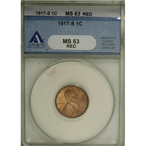 <B>1917-S 1C MS63 Red ANACS.</B></I> NGC Census: (4/16). PCGS Population (6/81). Mintage: 32,620,000. Numismedia Wsl. Price for NGC/PCGS coin in MS63: $325. (#2503)<BR><BR><B>Coin Engraver:</B> Victor D. Brenner<BR><BR><b>Shipping:</b> Coins & Currency (<a target="_blank" href="http://www.heritageauctions.com/common/shipping.php">view shipping information</a>)