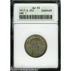 1917-S 25C Type One AU53 ANACS. Although briefly c <B>1917-S 25C Type One AU53 ANACS.</B></I> Although briefly circulated, subtle luster shimmers throughout this unmarked and attractive pearl-gray representative. The scarcest among the six different issues of 1917 Quarters. <BR><BR><B>Important notice:</B> Heritage usually auctions material at the rate of 200-250 lots per hour. On some occasions eBay Live bid software or the Internet may not be able to keep up with the pace of the auction. We recommend placing a realistic absentee bid now as insurance to avoid disappointment. Occasionally the auctioneer may eliminate or reject an eBay Live bid, and the auctioneer may also reopen a lot after the close of the eBay live bidding (usually because we missed an audience bid), and may reject your bid even if it shows you as the winning bidder. By bidding via eBay Live, you agree that Heritage may award the lot to another bidder at its sole discretion under the circumstances described above or any other reasonable circumstances. Since eBay bids are not shown to us until we open the lot on the floor, we treat those bids just like floor bids. In most cases the floor responds before the eBay bid is presented to us, due to Internet lag time, so for consistency we have made it a policy that floor bids are always considered first over tie eBay live bids. Also please note that all Heritage lots purchased through eBay Live carry a 20% Buyer's Premium. Please make sure you read the Terms and Conditions before you bid. This lot is being auctioned in conjunction with a live floor auction by Heritage Galleries & Auctioneers. All final auction and invoice information will be supplied by Heritage Galleries & Auctioneers, and all other information should be considered preliminary. Lot:5938