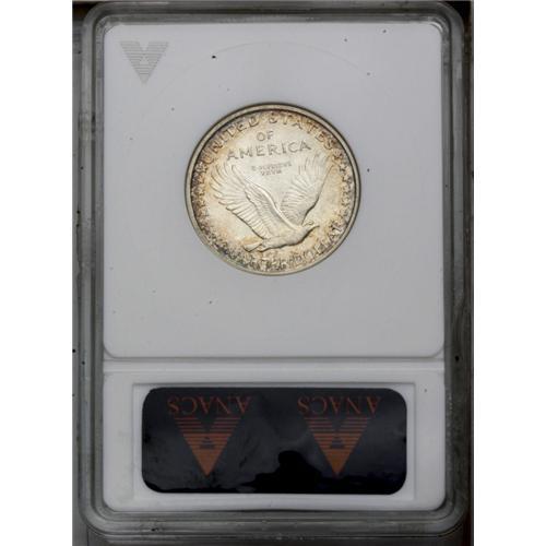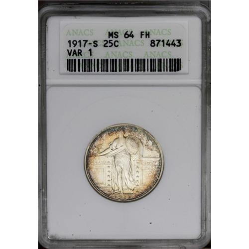 <B>1917-S<25C> Type One MS64 Full Head ANACS.</B></I> Boldly struck and appealing with white centers, golden-russet patina approaching the peripheries, and patches of steel-blue color around the peripheries. An aesthetically pleasing example of this first S-mint issue.