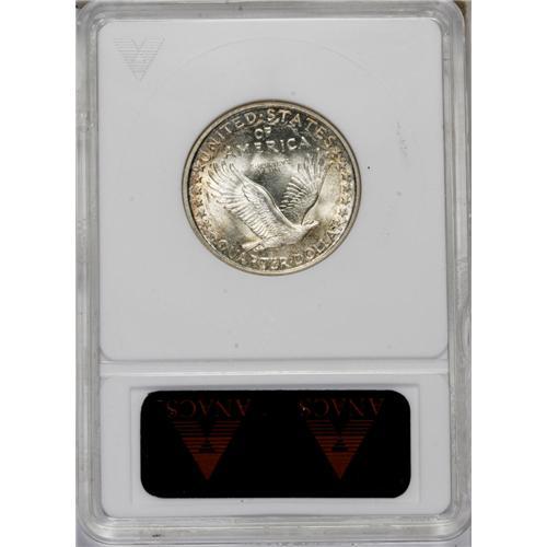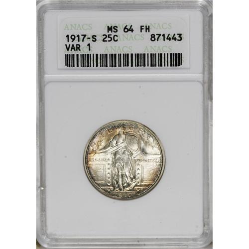 <B>1917-S<25C> Type One MS64 Full Head ANACS.</B></I> Crescents of amber and violet toning surround brilliant centers. Highly lustrous with plenty of detail and a few scattered marks.