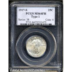 <B>1917-S<25C> Type One MS64 Full Head PCGS.</B></I> Bright matte-like surfaces, a subtle streak of opaque color bisects the obverse as the coin is turned under a light. <BR><BR><B>Important notice:</B> Heritage usually auctions material at the rate of 200-250 lots per hour. On some occasions eBay Live bid software or the Internet may not be able to keep up with the pace of the auction. We recommend placing a realistic absentee bid now as insurance to avoid disappointment. Occasionally the auctioneer may eliminate or reject an eBay Live bid, and the auctioneer may also reopen a lot after the close of the eBay live bidding (usually because we missed an audience bid), and may reject your bid even if it shows you as the winning bidder. By bidding via eBay Live, you agree that Heritage may award the lot to another bidder at its sole discretion under the circumstances described above or any other reasonable circumstances. Since eBay bids are not shown to us until we open the lot on the floor, we treat those bids just like floor bids. In most cases the floor responds before the eBay bid is presented to us, due to Internet lag time, so for consistency we have made it a policy that floor bids are always considered first over tie eBay live bids. Also please note that all Heritage lots purchased through eBay Live carry a 20% Buyer's Premium. Please make sure you read the Terms and Conditions before you bid.