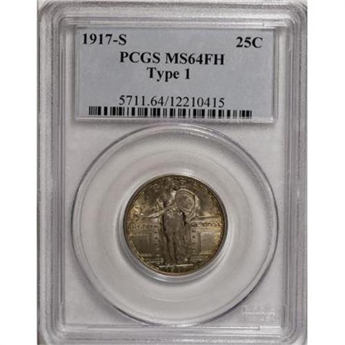 <B>1917-S 25C Type One MS64 Full Head PCGS.</B></I> Rich olive-gold and silver-blue patina drapes the shining surfaces of this sharply struck Type One quarter. Excellent eye appeal for the grade assigned, though a handful of tiny marks preclude Gem status.<BR><BR><B>Coin Engraver:</B> Hermon A. MacNeil<BR><BR><b>Shipping:</b> Coins & Currency (<a target="_blank" href="http://www.heritageauctions.com/common/shipping.php">view shipping information</a>)