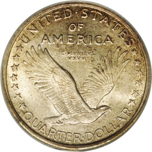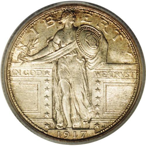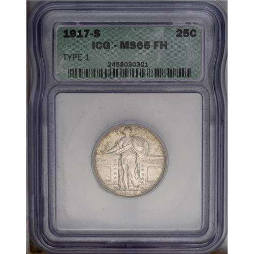 <B>1917-S<25C> Type One MS65 Full Head ICG.</B></I> Fully defined throughout with complete inner shield detail and full rivets. The mint luster is frosty and the coin displays mottled golden-russet color over the obverse and reverse. A small contact mark in the left reverse field keeps this coin from a technical MS66 grade.