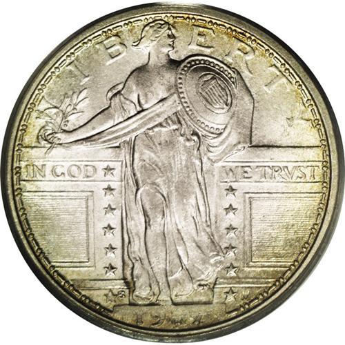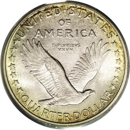 <B>1917-S<25C> Type One MS65 Full Head PCGS.</B></I> Although any 1917 Type One quarter, regardless of where it was struck, can easily be found with full head details, that fact does not diminish the importance of this specimen. It is fully lustrous with frosty surfaces on both sides that are accented by lovely champagne and gold toning. It is important to note that a portion of the date is not struck up on this piece. Otherwise, all aspects of this Gem are exceptional.