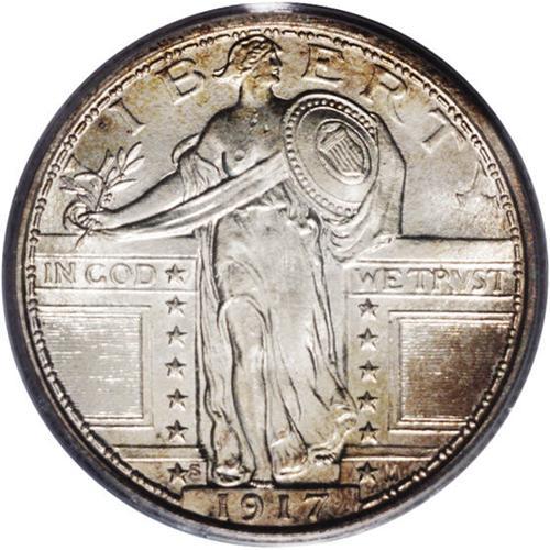 <B>1917-S<25C> Type One MS65 Full Head PCGS.</B></I> As if the presence of Full Head definition on a survivor of this S-mint issue were not enough, this important specimen also displays crisp definition on Liberty's gown lines, the shield, and the eagle's breast feathers that is quite uncommon for the series. Pleasing sunset-golden iridescence overlays the obverse border and part of the reverse, with strong underlying mint frost. Free of most trivial abrasions, this undeniable Gem would grace the finest quarter collection with its presence.