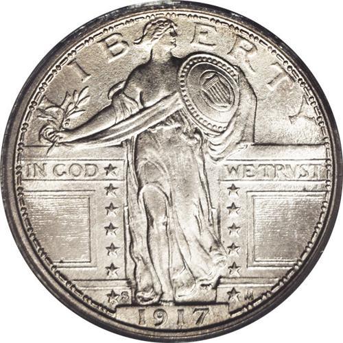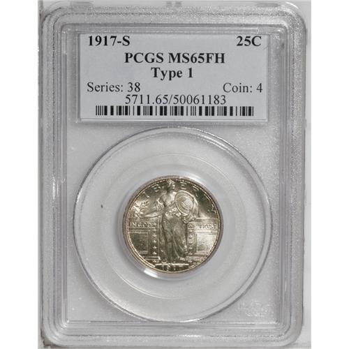 <B>1917-S<25C> Type One MS65 Full Head PCGS.</B></I> The well struck, exquisitely preserved surfaces of this lustrous Gem display a satiny, somewhat granular texture, and seem nearly pristine. A light champagne-gold patina graces each side. Exquisite details on the head complement the essentially full details on the shield. A nice coin for the grade.