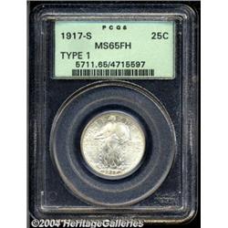 <B>1917-S<25C> Type One MS65 Full Head PCGS.</B></I> The well struck, exquisitely preserved surfaces of this lustrous Gem display a satiny, somewhat granular texture, and appear pristine. A lovely example of this scarcer Type One issue. Population: 83 in 65, 51 finer (3/04). <BR><BR><B>Important notice:</B> Heritage usually auctions material at the rate of 200-250 lots per hour. On some occasions eBay Live bid software or the Internet may not be able to keep up with the pace of the auction. We recommend placing a realistic absentee bid now as insurance to avoid disappointment. Occasionally the auctioneer may eliminate or reject an eBay Live bid, and the auctioneer may also reopen a lot after the close of the eBay live bidding (usually because we missed an audience bid), and may reject your bid even if it shows you as the winning bidder. By bidding via eBay Live, you agree that Heritage may award the lot to another bidder at its sole discretion under the circumstances described above or any other reasonable circumstances. Since eBay bids are not shown to us until we open the lot on the floor, we treat those bids just like floor bids. In most cases the floor responds before the eBay bid is presented to us, due to Internet lag time, so for consistency we have made it a policy that floor bids are always considered first over tie eBay live bids. Also please note that all Heritage lots purchased through eBay Live carry a 20% Buyer's Premium. Please make sure you read the Terms and Conditions before you bid.