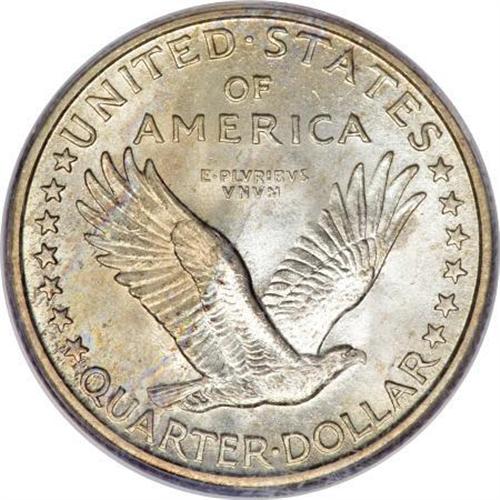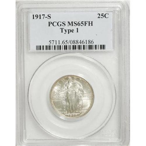<B>1917-S 25C Type One MS65 Full Head PCGS.</B></I> The three Type One issues of 1917 are each available with Full Head details, although only the Philadelphia Mint issue can be found with any frequency. The two branch mint coins are much scarcer with sharp strikes. This example is one such coin with all design elements on each side fully impressed. The surfaces have frosty silver luster with a hint of gold on the reverse. <BR><I>From The Hoffy Collection, NGC's #3 Registry Collection of Standing Liberty Quarters.</B></I><BR><BR><B>Coin Engraver:</B> Hermon A. MacNeil<BR><BR><b>Shipping:</b> Coins & Currency (<a target="_blank" href="http://www.heritageauctions.com/common/shipping.php">view shipping information</a>)