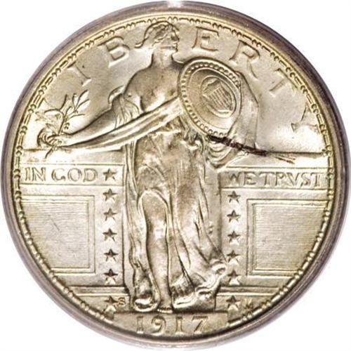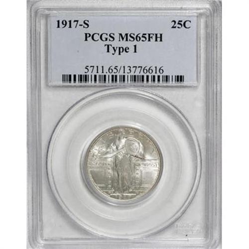 <B>1917-S 25C Type One MS65 Full Head PCGS.</B></I> This impressive Gem has flashy, intensely lustrous surfaces that reveal fine grain textures under low magnification. It is essentially untoned, except for a streak of red-brown color just below the shield. Carefully preserved and free of distractions, this piece is also boldly struck, with full detail on Liberty's head and shield rivets. <BR><BR><B>Coin Engraver:</B> Hermon A. MacNeil<BR><BR><b>Shipping:</b> Coins & Currency (<a target="_blank" href="http://www.heritageauctions.com/common/shipping.php">view shipping information</a>)