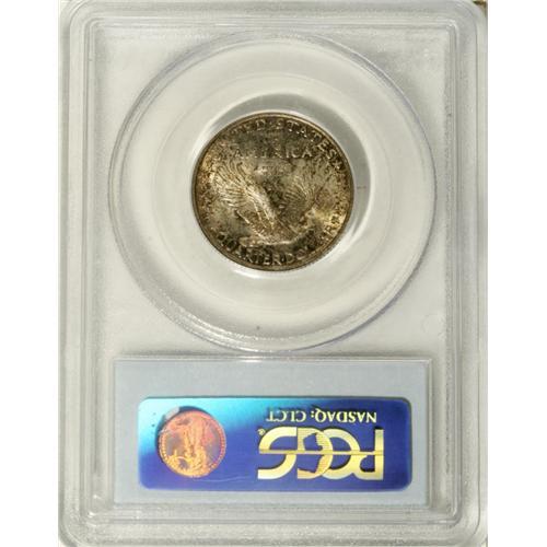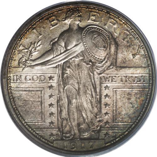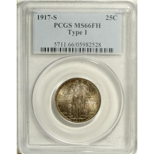<B>1917-S 25C Type One MS66 Full Head PCGS.</B></I> A coin "fully" deserving of the Full Head designation, with bold definition not only on Liberty's head, but also on her toes, all the shield rivets and lines, and her hand that grasps the olive branch. Complementing the near-full strike is lovely patination in shades of green, gold, and lilac, with mottled smoke-gray toning on the reverse. A nice one! Population: 48 in 66 Full Head, 9 finer (1/07).<BR><BR><b>Shipping:</b> Coins & Currency (<a target="_blank" href="http://www.heritageauctions.com/common/shipping.php">view shipping information</a>)
