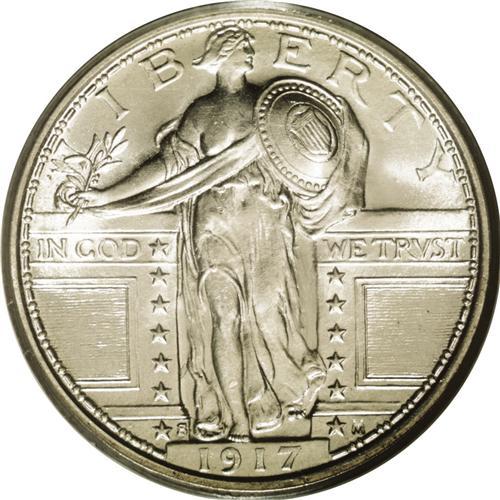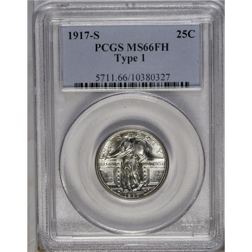 <B>1917-S<25C> Type One MS66 Full Head PCGS.</B></I> Mintmarked Type One Full Head quarters in this lofty grade--and especially the S-mint issue--are many times scarcer than their P-mint brethren, although the price differential are not nearly so steep as the population data would suggest. This frosty, untoned example offers <I>both</B></I> just-struck brilliance and preservation that is nearly immaculate. All shield rivets are full, although the left top of the shield and the horizontal lines immediately below are a bit weak. Mentionable abrasions are few, the sole exception being a single tick on Liberty's left (facing) calf. If you prefer your coins high-end and brilliant, you would do well to give this blazer serious consideration. Population: 45 in 66 Full Head, 10 finer (6/06).