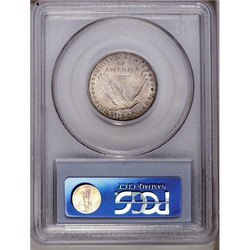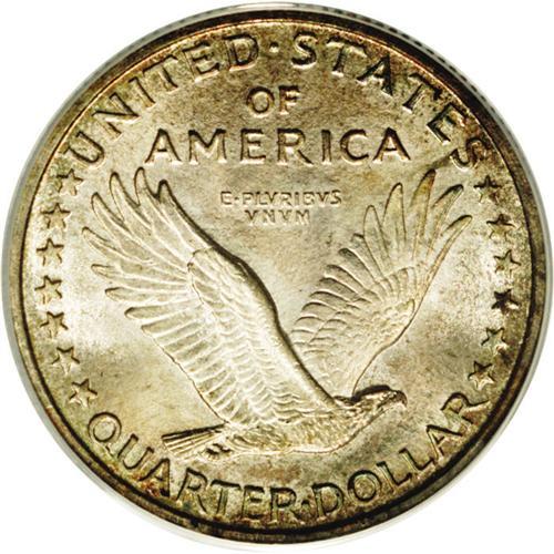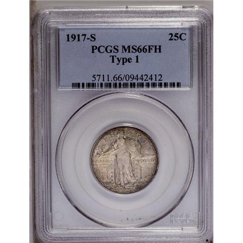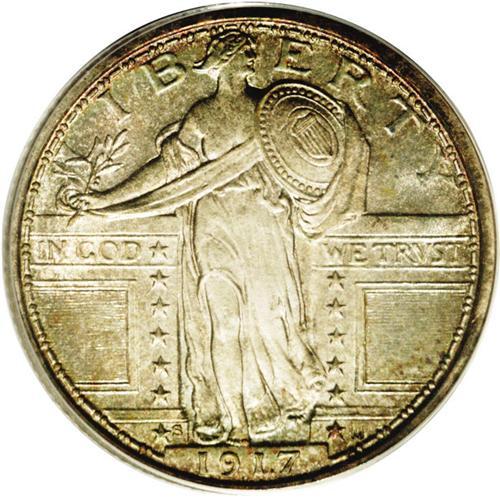 <B>1917-S<25C> Type One MS66 Full Head PCGS.</B></I> J.H. Cline, in his treatise titled <I>Standing Liberty Quarters,</B></I> indicates that most '17-S Type One quarters were weakly struck. This includes Liberty's head, the rivets closest to Liberty's body, the date, and the eagle's breast feathers and head. The Premium Gem offered here is an obvious exception. The sharp strike transcends Liberty's head to include the previously mentioned elements. Dazzling luster exudes from impeccably preserved surfaces that are bathed with a delicate coating of pastel golden-tan, lilac, and ice-blue toning. A tiny mark in the upper left (facing) part of the shield and another on Liberty's neck are mentioned solely for accuracy. Population: 43 in 66, 9 finer (2/06).