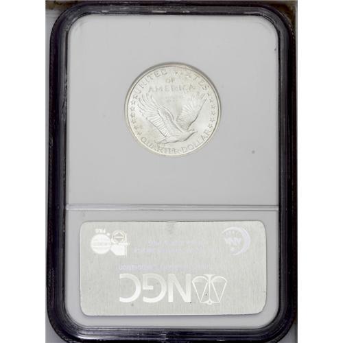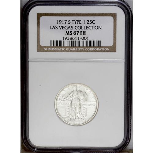 <B>1917-S<25C> Type One MS67 Full Head NGC.</B></I> Ex: Las Vegas Collection. Scarcest of the Type One quarters, this piece displays absolute full detailing in all areas, even the rivets in the shield are complete. Bright and lustrous, the surfaces are completely untoned and snow-white overall. A splendid coin and unimprovable in technical grade--we also doubt this coin could be excelled in terms of overall visual appeal. Census: 15 in 67, 0 finer (3/06).