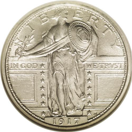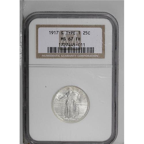<B>1917-S<25C> Type One MS67 Full Head NGC.</B></I> Outstanding quality for this date and mint, and this one is tied with an illustrious group for the finest graded of this issue. Note the radiant luster in the fields, and the curious matte-like texture that is seen on many 1916 and 1917 quarters. The textured luster is particularly prevalent on the obverse, less so in the reverse fields. Sharply impressed by the dies, with strong definition on the shield, date, knee, breast, and other highpoints. Virtually brilliant, but careful scrutiny locates a trace of gold toning on the lower reverse field. As nice as this date is ever found, with the combined NGC and PCGS population reports showing 24 pieces (6/06) graded this high with none finer.