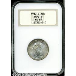 <B>1917-S<25C> Type One MS67 NGC.</B></I> Even though 443,000 more pieces were struck of the S-mint Type One than the D-mint, the S-mint is worth significantly more and is by far the most difficult of the three Type One issues to locate with full head detail. This coin has unusually attractive surfaces. It is matte-like over each side with an overlay of soft, frosted mint luster. The striking details are complete throughout and there are no mentionable abrasions on either side. Well balanced also, both obverse and reverse display light gray and golden toning. This really is quite a remarkable coin and should be closely examined by specialists in the series. Population: 1 in 67, 0 finer (7/04). <BR><BR><B>Important notice:</B> Heritage usually auctions material at the rate of 200-250 lots per hour. On some occasions eBay Live bid software or the Internet may not be able to keep up with the pace of the auction. We recommend placing a realistic absentee bid now as insurance to avoid disappointment. Occasionally the auctioneer may eliminate or reject an eBay Live bid, and the auctioneer may also reopen a lot after the close of the eBay live bidding (usually because we missed an audience bid), and may reject your bid even if it shows you as the winning bidder. By bidding via eBay Live, you agree that Heritage may award the lot to another bidder at its sole discretion under the circumstances described above or any other reasonable circumstances. Since eBay bids are not shown to us until we open the lot on the floor, we treat those bids just like floor bids. In most cases the floor responds before the eBay bid is presented to us, due to Internet lag time, so for consistency we have made it a policy that floor bids are always considered first over tie eBay live bids. Also please note that all Heritage lots purchased through eBay Live carry a 20% Buyer's Premium. Please make sure you read the Terms and Conditions before you bid. </span></font></tr></table></td></tr></table>