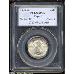 <table><tr><td><TABLE cellSpacing=0 cellPadding=0 width="100%" bgColor=#000000 border=0><TBODY> <TR><TD width="100%"><TABLE cellSpacing=1 cellPadding=3 width="100%" border=0><TBODY><TR><TD width="100%" bgColor=#79735c><FONT face=arial color=#ffffff size=3><B>Description</B> </FONT></TD></TR><TR><TD width="100%" bgColor=#ffffff><FONT face=arial size=2><B>1917-S 25C Type One MS67 PCGS.</B></I> Appealing champagne-gold and silver-gray patina adorns the obverse while much of the reverse is brilliant, save for a dark crescent of color on the left side. Although very well struck overall, the definition of this piece is just about average for the '17-S Type One. Population: 2 in 67, 0 finer (10/03). </FONT></TD></TR></TBODY></TABLE></TD></TR></TBODY></TABLE><BR><A name=PricesRealized></A><TABLE cellSpacing=0 cellPadding=0 width="100%" bgColor=#000000 border=0><TBODY><TR><TD width="100%"><TABLE cellSpacing=1 cellPadding=3 width="100%" border=0><TBODY><TR><TD width="100%" bgColor=#79735c><A name=PR><FONT face=arial color=#ffffff size=3><B>Previous Prices from Heritage Auctions</B> </FONT></A></TD></TR><TR><TD bgColor=#f6f6ed>No Prior Data Recorded </TD></TR><TR><TD bgColor=#ffffff><FONT face=arial size=1 ?>PLEASE NOTE: All prices realized reflect the final hammer price PLUS the buyer's premium in auctions that charge a buyer's premium. Each item has a notation at the top of the listing indicating whether that lot included a buyer's premium. Example: A item that sells with a final hammer price of $100 and a 20% buyer's premium will display with a price realized of $120. All information listed is intended to be as accurate as possible, but errors are possible. Please use this guide carefully and inform us of any inaccuracies. </FONT></TD></TR></TBODY></TABLE></TD></TR></TBODY></TABLE><BR><TABLE cellSpacing=0 cellPadding=0 width="100%" bgColor=#000000 border=0><TBODY><TR><TD width="100%"><TABLE cellSpacing=1 cellPadding=3 width="100%" border=0><TBODY><TR><TD width="100%" bgColor=#79735c colSpan=6><FONT face=arial color=#ffffff size=3><B>Price Guide*</B> </FONT></TD></TR><TR bgColor=#f6f6ed><TD align=middle><B>Grade</B> </TD><TD align=middle><B>Coin World<BR>(Trends)</B> </TD><TD align=middle><B>Numismedia<BR>Retail</B> </TD><TD align=middle><B>Numismedia<BR>Wholesale</B> </TD><TD align=middle><B>Coin<BR>Universe</B> </TD><TD align=middle><B>Heritage<BR>Value Index</B> </TD></TR><TR bgColor=#ffffff><TD align=middle>66</TD><TD align=right>---</TD><TD align=right>---</TD><TD align=right>$1,650.00</TD><TD align=right>$2,675.00</TD><TD align=right>$2,183.75</TD></TR><TR style="FONT-WEIGHT: bold" bgColor=#cccfdd><TD align=middle>67</TD><TD align=right>---</TD><TD align=right>---</TD><TD align=right>$5,875.00</TD><TD align=right>---</TD><TD align=right>---</TD></TR><TR bgColor=#ffffff><TD align=middle>68</TD><TD align=right>---</TD><TD align=right>---</TD><TD align=right>---</TD><TD align=right>---</TD><TD align=right>---</TD></TR><TR bgColor=#ffffff><TD colSpan=6><FONT size=1>*All information listed is intended to be as accurate as possible, but errors are possible. No item may be returned or refused based on this information which is provided as a service to our customers. You should contact each pricing source directly to determine the accuracy of this information. </FONT></TD></TR></TBODY></TABLE></TD></TR></TBODY></TABLE><BR><TABLE cellSpacing=0 cellPadding=0 width="100%" bgColor=#000000 border=0><TBODY><TR><TD width="100%"><TABLE cellSpacing=1 cellPadding=3 width="100%" border=0><TBODY><TR><TD width="100%" bgColor=#79735c><FONT face=arial color=#ffffff size=3><B>Population Guide</B> </FONT></TD></TR><TR bgColor=#ffffff><TD align=middle><!-- Begin Output of Population Grid--><TABLE cellSpacing=0 cellPadding=0 width="100%" border=0><TBODY><TR><TD vAlign=center><TABLE cellSpacing=0 width="100%" border=1 cellsadding="3"><TBODY><TR><TD vAlign=center><TABLE cellSpacing=0 cellPadding=3 width="100%" border=1><TBODY><TR><TD vAlign=center align=middle bgColor=#f0f1e8 colSpan=2 <CENTER><FONT face=Arial size=2><B>PCGS Pop </B></FONT><CENTER></CENTER></TD><TD vAlign=center align=middle bgColor=#f0f1e8 colSpan=2><CENTER><FONT face=Arial size=2><B>NGC Pop</B></CENTER></FONT></TD></TR><TR><TD vAlign=center><FONT face=Arial size=2>(67)</FONT> </TD><TD vAlign=center align=right><FONT face=Arial size=2>2</FONT> </TD><TD vAlign=center><FONT face=Arial size=2>(67)</FONT> </TD><TD vAlign=center align=right><FONT face=Arial size=2>1</FONT> </TD></TR><TR><TD vAlign=center><FONT face=Arial size=2>(>67)</FONT> </TD><TD vAlign=center align=right><FONT face=Arial size=2>0</FONT> </TD><TD vAlign=center><FONT face=Arial size=2>(>67)</FONT> </TD><TD vAlign=center align=right><FONT face=Arial size=2>0</FONT> </TD></TR></TBODY></TABLE></TD></TR></TBODY></TABLE></TD></TR></TBODY></TABLE><!-- End Output of Population Grid--></TD></TR></TBODY></TABLE></TD></TR></TBODY></TABLE><BR><TABLE cellSpacing=0 cellPadding=0 width="100%" bgColor=#000000 border=0><TBODY><TR> Important notice: Heritage usually auctions material at the rate of 200-250 lots per hour. On some occasions eBay Live bid software or the Internet may not be able to keep up with the pace of the auction. We recommend placing a realistic absentee bid now as insurance to avoid disappointment. Occasionally the auctioneer may eliminate or reject an eBay Live bid, and the auctioneer may also reopen a lot after the close of the eBay live bidding (usually because we missed an audience bid), and may reject your bid even if it shows you as the winning bidder. By bidding via eBay Live, you agree that Heritage may award the lot to another bidder at its sole discretion under the circumstances described above or any other reasonable circumstances. Also please note that all Heritage lots purchased through eBay Live carry a 20% Buyer's Premium. Please make sure you read the Terms and Conditions before you bid.</TD></TR></TBODY></TABLE></TD></TR></TBODY></TABLE>